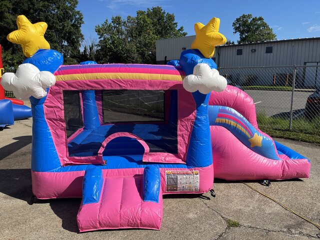 Please Note: The Toddler Enchanted Combo is 9 feet by 13 feet and is designed for toddlers and fits well into more compact spaces that our normal size combo bounce houses would not fit. It features an inflatable safety ramp at the entrance to protect excited kids as they scramble to get inside the bouncer. It has large netted vent windows that keep things cool for the kids and allows parents to keep a watchful eye on all activities inside. It also has a dual lane slide on the side of the bounce house. This bounce house can be used indoors (requires height clearance of 7.5 feet) or outdoors. Approximately 4-5 users at a time.